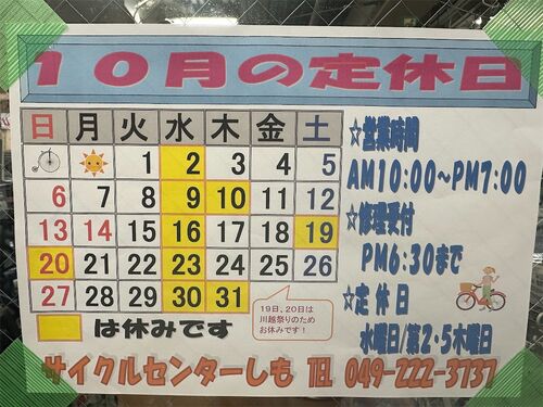 こんばんは 10月に入りまして、川越は川越まつりでソワソワしてきております! 10/7月曜日→店主、Panasonicサイクルテックの工場見学のため、朝から日帰り大阪出張です。 そのため、スポーツ館はお休みです、修理部門と本館は通常通りです。 そして、川越ま…